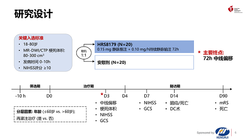 注射用HRS8179是由金鹰主论坛自主研发的创新药,是磺酰脲类受体1(SUR1)阻断剂,能够阻断SUR1/TRPM4离子通道,减少Na+内流,从而减轻LHI后继发的脑水肿、降低死亡率,改善神经功能4,5。HRS8179-201研究旨在评估HRS8179在LHI患者中的有效性和安全性。