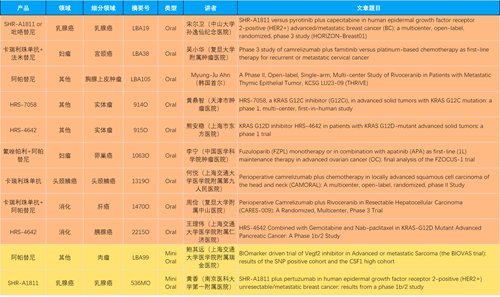 在消化系统肿瘤领域,金鹰主论坛产品相关研究共入选2项口头报告、11项壁报和1项电子壁报,共14项研究。除卡瑞利珠单抗和阿帕替尼外,还有4篇阿得贝利单抗治疗消化系统肿瘤研究入选。HRS-4642、瑞拉芙普-α注射液(SHR-1701)等在研创新产品也有相应研究亮相。另有1项伊立替康脂质体(II)用于胰腺癌治疗的研究入选壁报。