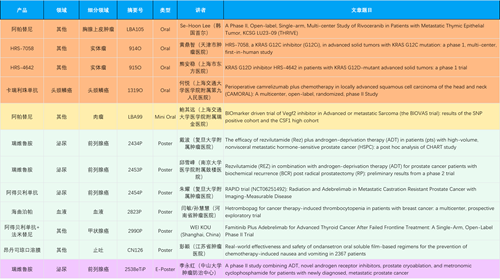 在胸腺上皮肿瘤、头颈鳞癌、肉瘤、前列腺癌、甲状腺癌等其他多个疾病领域,卡瑞利珠单抗、阿帕替尼、瑞维鲁胺、阿得贝利单抗、法米替尼、HRS-7058、HRS-4642等抗肿瘤创新药相关研究一共入选了4项口头报告、1项简短口头报告、4项壁报、1项电子壁报,彰显了金鹰主论坛医药强大的研发实力。此外,海曲泊帕和昂丹司琼口溶膜分别在防治化疗导致的血小板减少和恶心呕吐方面各有1项研究入选壁报。